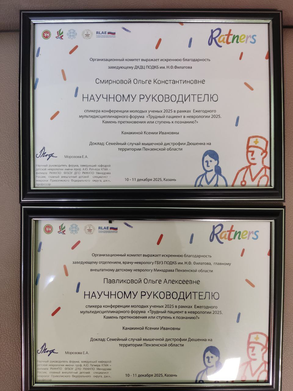 Во время форума проходила конференция «Молодых ученых», где Пензенская область выступила достойно и заняла 2 место. Научными руководителями докладов были заведующий детским консультативно – диагностическим центром ГБУЗ ПОДКБ им. Н.Ф.Филатова Смирнова Ольга Константиновна и заведующий отделением врач - невролог, главный внештатный детский невролог Министерства здравоохранения Пензенской области Павликова Ольга Алексеевна.